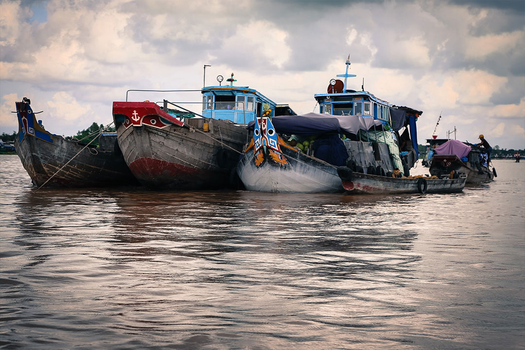 Approaching the northern Delta on the Hau River, I visit a Cham village that lies behind a curtain of mangroves and Nipa palms. Children play on a long rickety jetty, leaping into the river as a warm rain sets in. The Cham people are a Muslim minority and one of the oldest communities to settle in this area. Their homes are set on high stilts, and the ground is slippery clay. This is a town designed to ride out the annual flood season.
